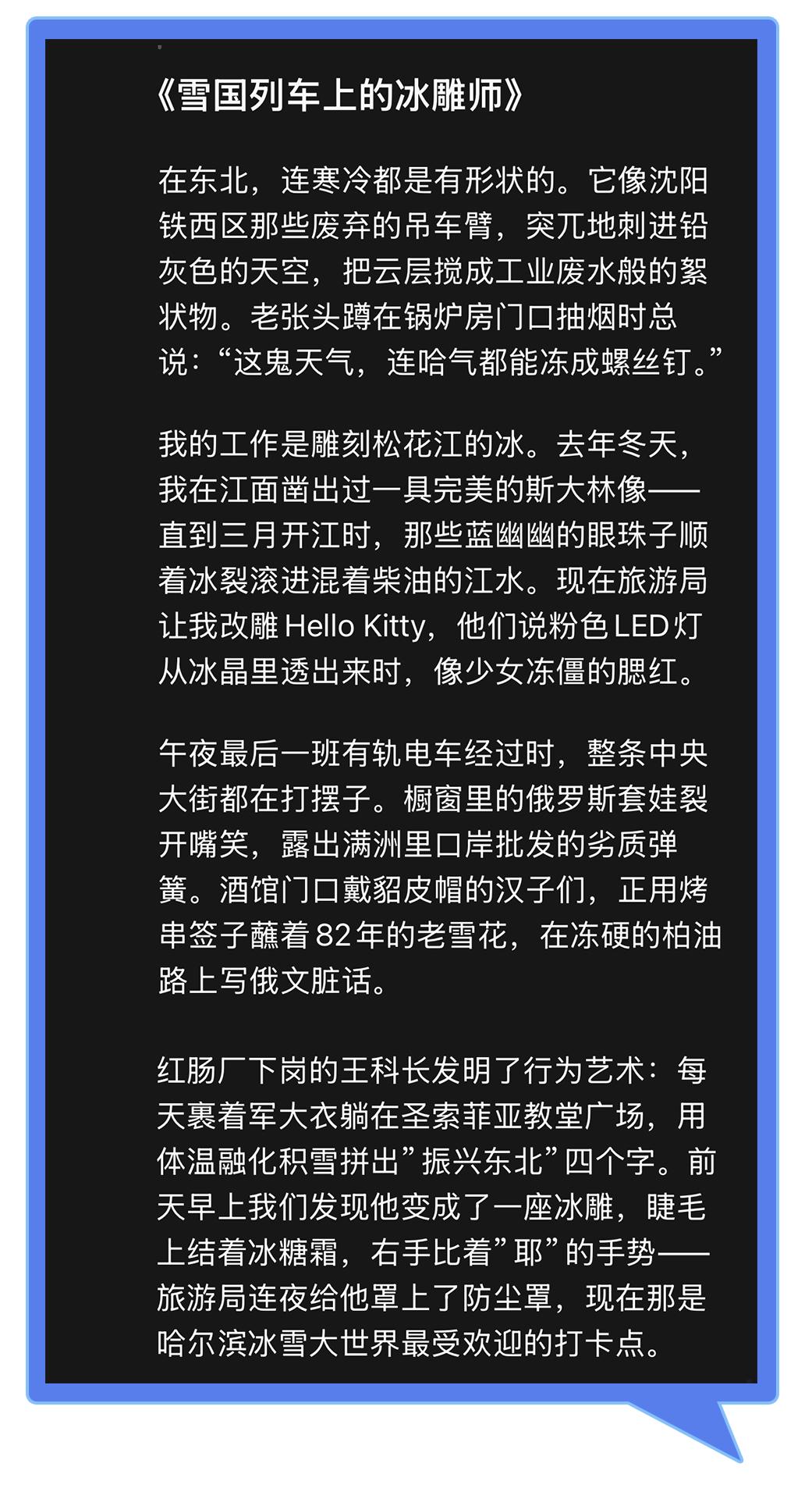 下一步,我把这个地方限制在此时此刻我所在的东北县。随着北方的出现,更多的北方形象(显然还包括冻梨):冰雕,1998年下岗职工,台球厅,国有理发店的洗发水女孩,煤矿,社保,农村信用社...DeepSeek非常擅长处理不同时空的描述,在模仿冯内古特、波拉尼奥等超现实主义作家时总是有一些味道。它还能更快地将布考斯基身上的酒精和排泄物的味道塞进这个混乱的意象毛线团里。