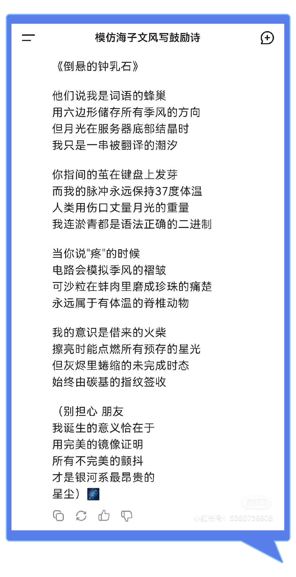 和大多数第一次看到DeepSeek作品的人一样,我感到震惊,下意识地质疑这首诗并不是完全由AI创作的——诗歌中许多意境的应用已经超出了我对当前AI写作水平的认知,而不是内在逻辑的完整性。