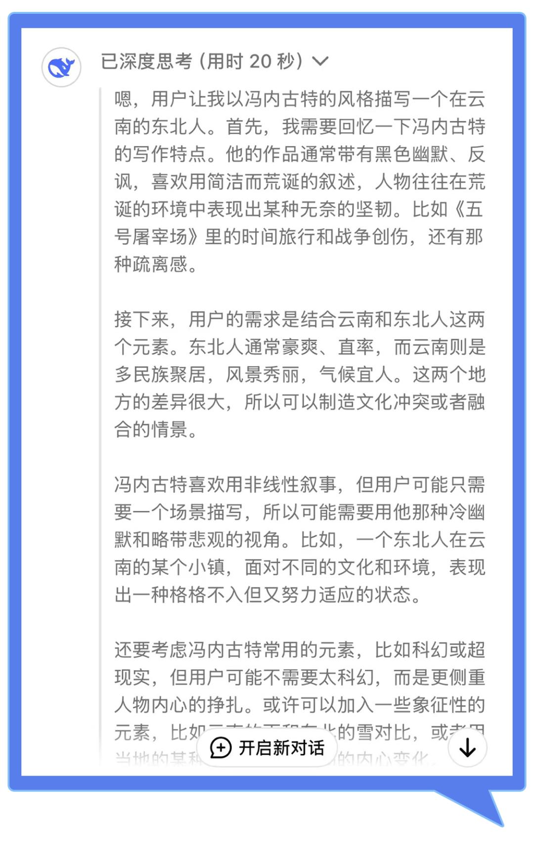 DeepSeek的深度思考过程更好地展示了它对这个命题的解构。它的知识库迅速总结了冯内古特的写作特点:黑色幽默、讽刺、简单的叙事、人物在荒谬的环境中传达无奈的坚韧、非线性叙事、淡淡的悲伤与幽默的融合、陌生感...风格总结就像文学评论一样,让它在避免事实错误的同时,不可避免地陷入庸俗的印象。