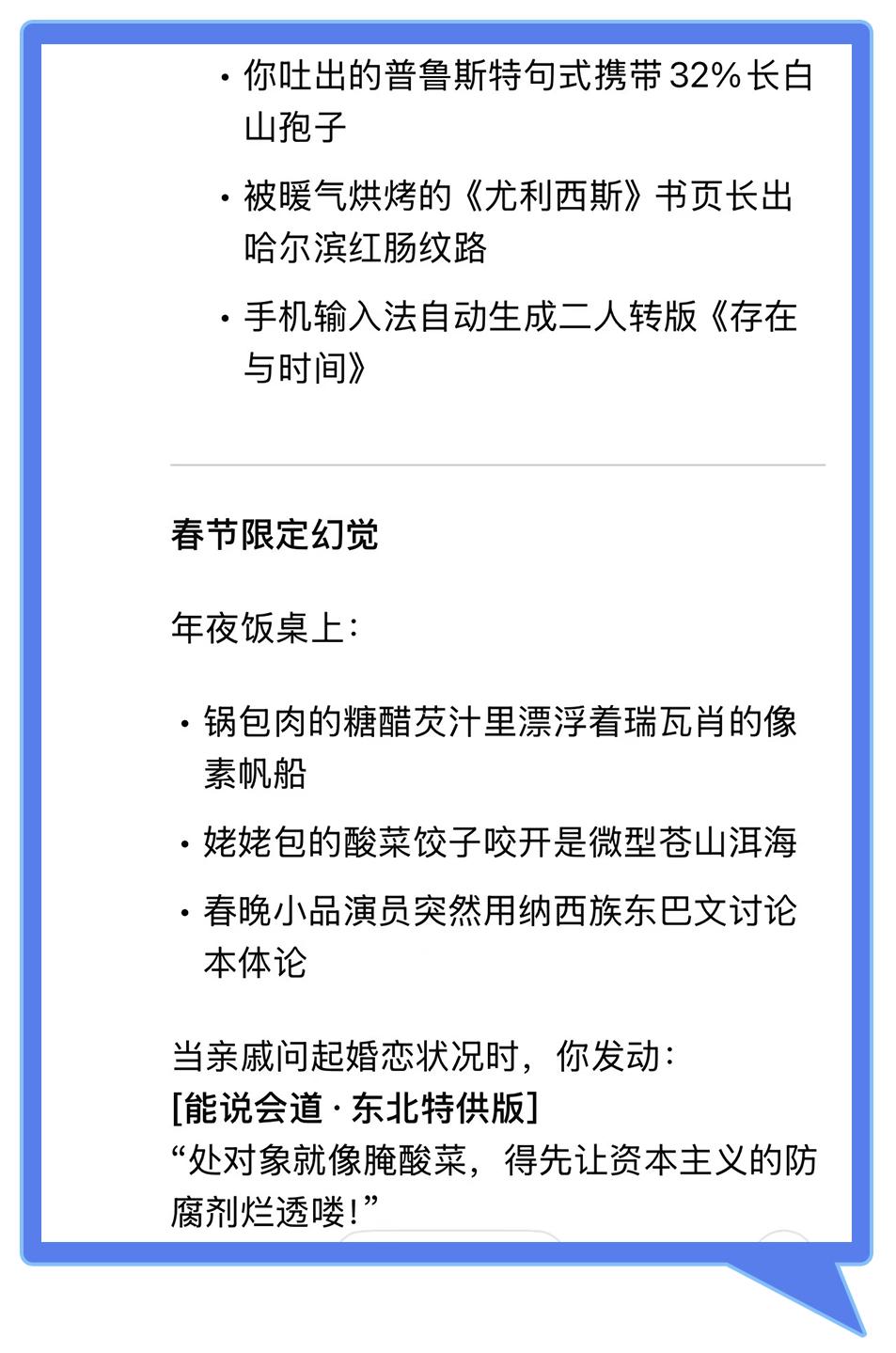 但是这次,随着越来越多的编辑和作家朋友开始在除夕夜分享他们的DeepSeek创作的文本,我意识到DeepSeek可能真的值得一试——至少它会比看春晚更精彩。