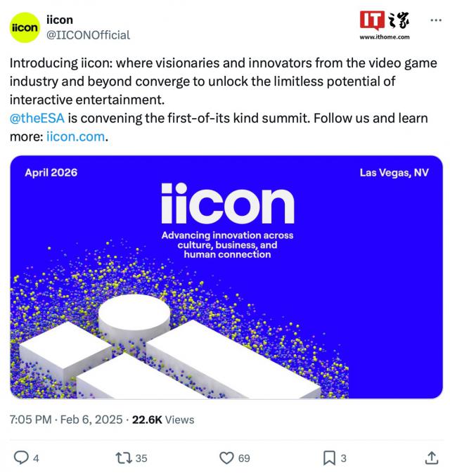 IT 世家 2 月 7 日消息,前 E3 策划者“娱乐软件协会”(ESA)“互动创新大会宣布了一个名字”(Interactive Innovation Conference,简称 iicon)“游戏展览,旨在“利用互动娱乐的力量,将远见者、思想领袖和各行业的开拓者联系起来”。