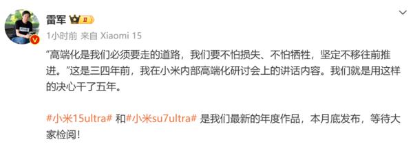 在 2 月份,小米还将带来两款车型。 Ultra 等级产品-小米 15 Ultra 和小米 SU7 Ultra,它还将成为小米继续冲击高档作品的最新作品。