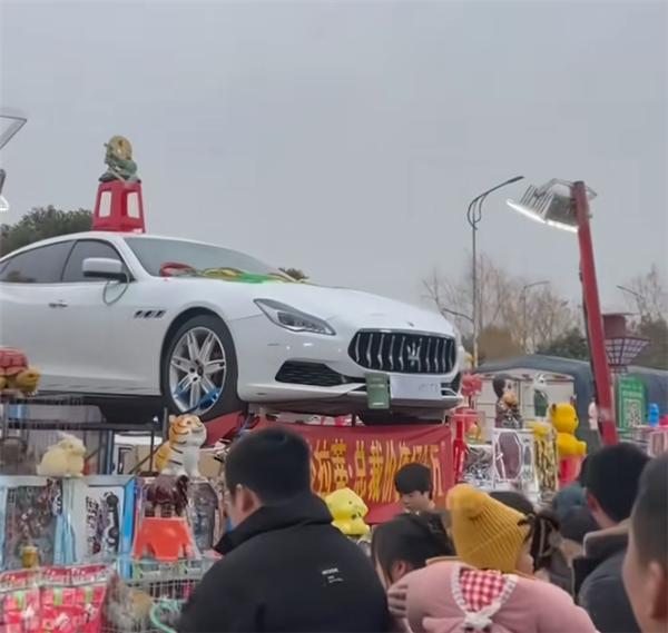 在玛莎拉蒂的顶部有一个毛娃娃,套圈老板说,这是一辆二手玛莎拉蒂,专门为套圈买的,套中毛娃娃就可以把车开走。