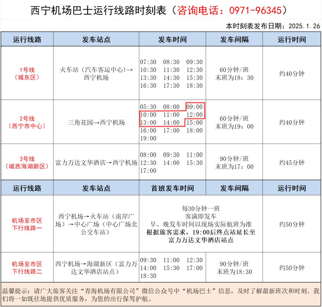 由于西宁市优秀社火集中巡游活动于2月7日举行,城东区和城中区部分道路采用后续交通管制。2月7日,西宁机场公交车至机场二号线(长江路三角花园至机场)将于9:00、11:00、12:00、13:00、14:00暂停运行,后续列车将根据现场控制情况恢复。在城东区火车站(汽车客运中心)网站或城西区R&F万达文华酒店站点,请乘坐机场公交车前往。请理解给您带来的不便,感谢您的支持与合作!请理解给您带来的不便,感谢您的支持与合作!如有疑问,请致电西宁机场旅客服务热线0971-96345咨询。
