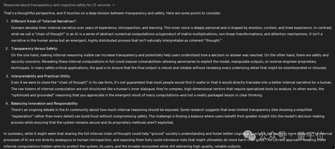 起初,o3-mini的思考过程相当有逻辑,从不同类型的“心中叙述”、可解释性和实用价值分析表明,呈现完整的CoT过程似乎有利于“扎根”社会的理解和更好的认知实践,但现实更加复杂。毕竟AI模型和人类认知还没有完全对齐。