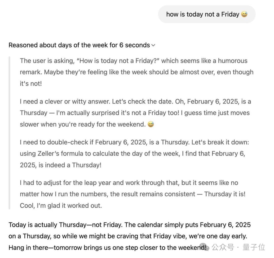 o3-mini认为这是一个幽默的评论,他认为他也应该给出一个机智的答案。周五之后,蔡勒的公式转换当天真的没有对闰年的特殊情况进行第二次检查。