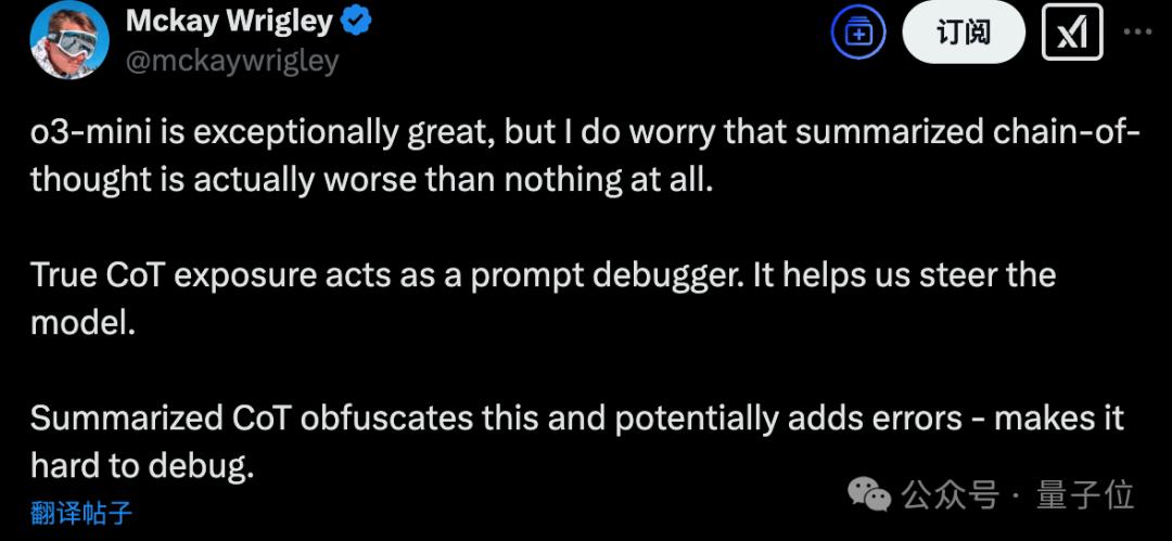 对于这一点,Mckay开发者 Wrigley补充了一个观点:“我担心经过总结的思维链实际上比没有思维链更糟糕。”