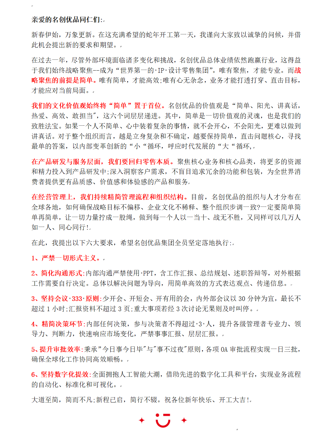 这次在蛇年开工第一天的赠言中再次强调,进一步凸显了名创优品提高管理效率、实现战略焦点的决心。