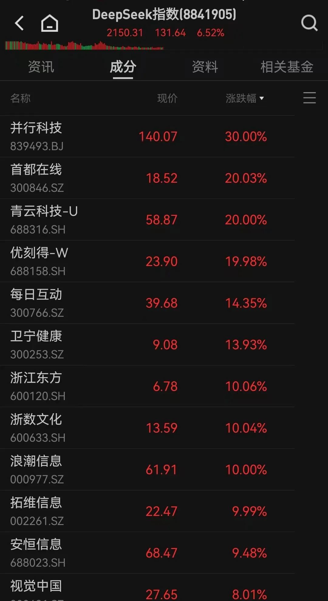 总的来说,DeepSeek的概念还在继续上升。万得DeepSeek概念指数盘上涨超过6%。该指数的成份股中,并行科技板块“30cm”涨停,首都在线,青云科技-U、优刻得-W板块“20厘米”涨停,每日互动板块涨幅超过14%,浙江东方、浙江数字文化、浪潮信息、拓维信息、视觉中国等多芯板块涨停。