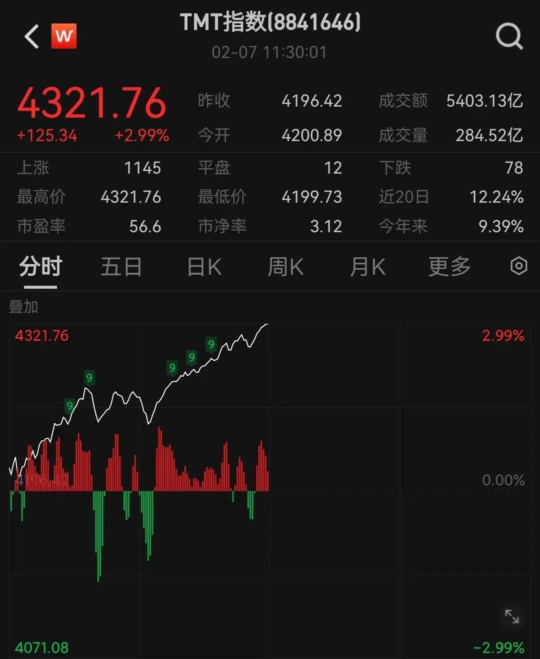 今天上午,a股市场整体进一步上涨。截至中午收盘,上证指数涨幅超过1%,再次站在3300点整数关口;深证指数涨幅超过2%,创业板指数涨幅超过3%,北证50指数涨幅接近6%,TMT跑道继续走强。