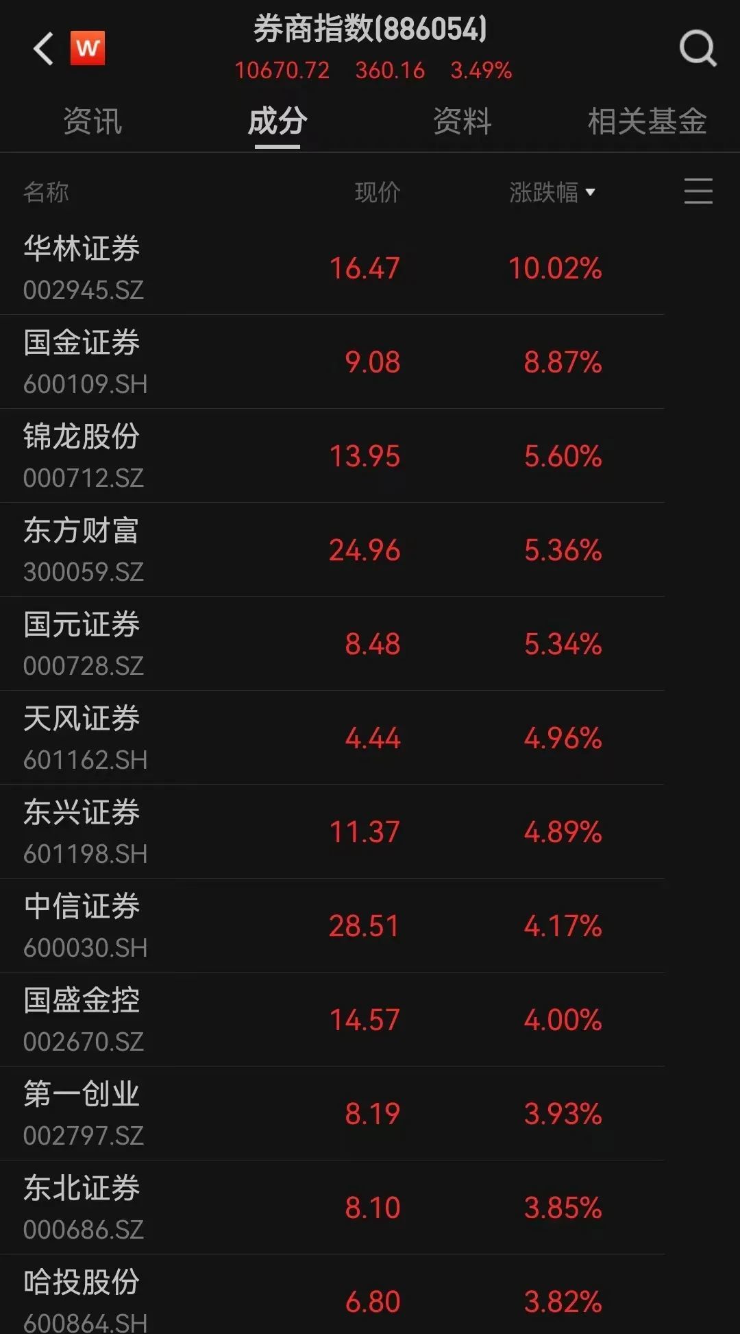 券商板块有一波上涨,板块涨幅超过3%。其中,华林证券直线封板,国金证券涨幅近9%,锦龙股份、东方财富、国元证券涨幅超过5%,中信证券涨幅超过4%。