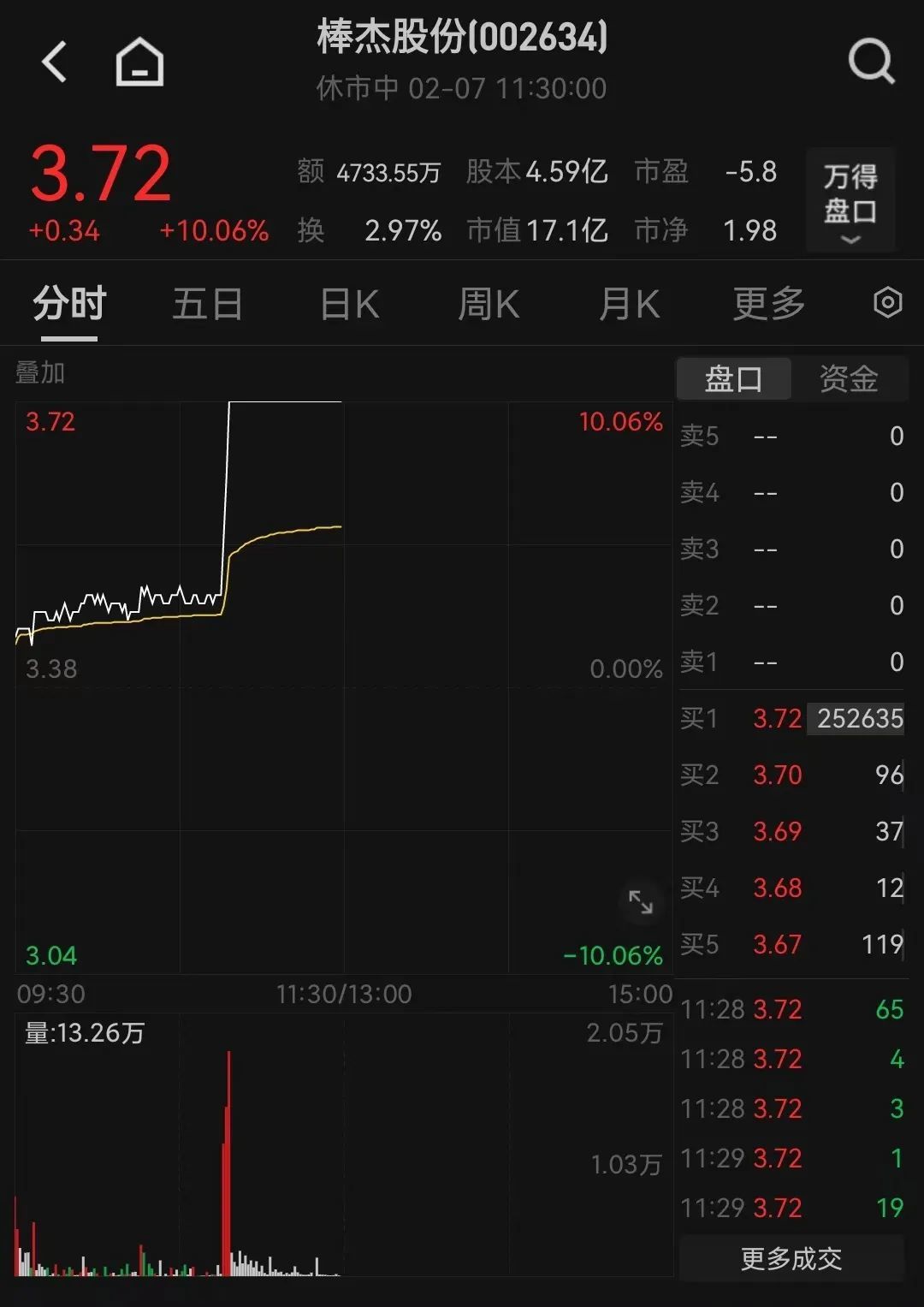 另外,在接近上午11点的时候,棒杰股份也直线上涨,并冲到了日线极限。