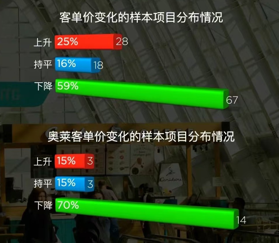 就客单量变化而言,近60%的样本项目客单量下降,奥莱样本中只有3个项目客单量上升。