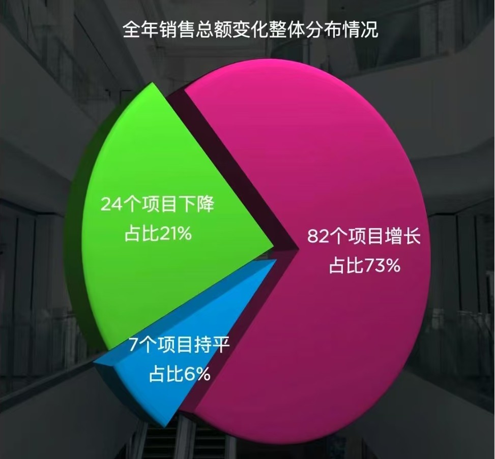 从年度总销售额来看,超过70%的项目年度总销售额增长,超过20%的项目不同程度下降。在持平线的基础上,2024年持平线以上82个样本项目年销售额同比增长,占73%。24个样本项目年销售额呈下降趋势,占21%。强大的运营和销售仍然是一项重要的工作。
