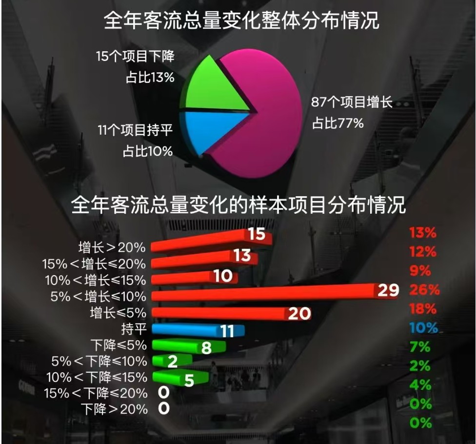 就年度客流总量而言,近80%的项目年客流量同比增长,13%的项目年客流量同比下降。