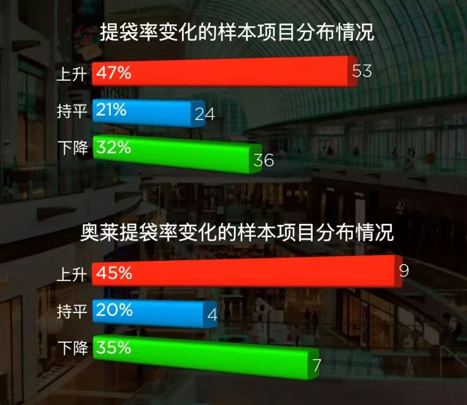 从包装率来看,近一半项目的包装率有所上升,超过30%的项目包装率有所下降,而奥莱样本项目的包装率并没有明显好于其他类型的购物中心。