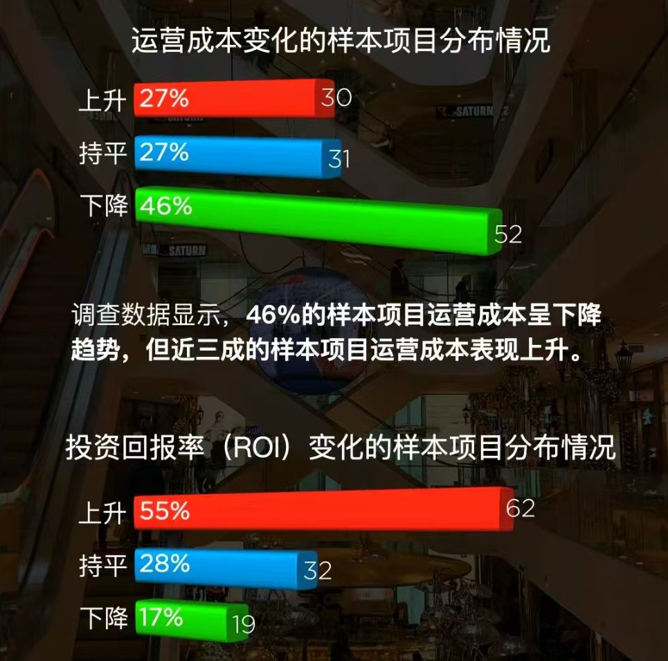 从运营成本和投资回报来看,“降低成本”仍需脚踏实地地继续推进。调查数据显示,46%的样本项目运营成本呈下降趋势,但近30%的样本项目运营成本呈上升趋势。55%的样本项目投资回报率ROI(ROI=2024年运营净收益/运营成本呈上升趋势,但17%的样本项目呈下降趋势,近30%的样本项目呈稳定趋势。