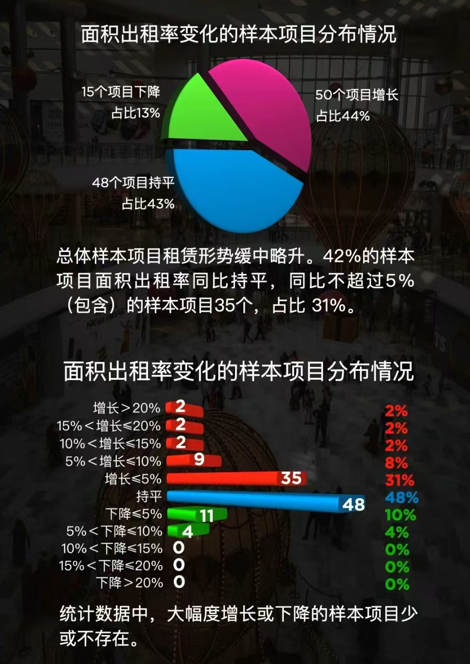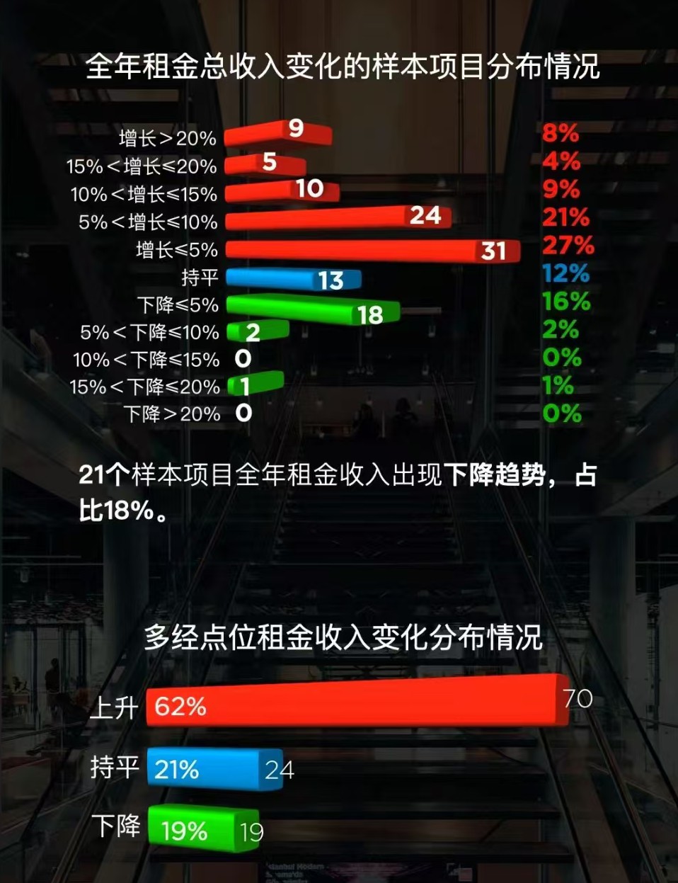 从年租金收入来看,70%以上的样本项目主要小幅增长,多点租金大幅增长。79个样本项目年租金收入同比增长,占70%。;在这些项目中,24个样本项目比上年同期超过10%,9个样本项目比上年同期超过20%。