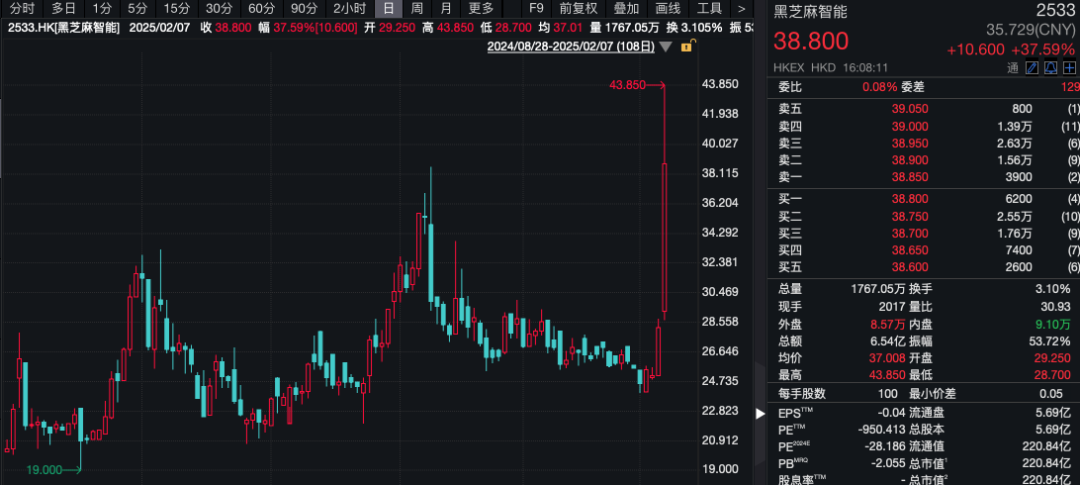 港股市场上,港股黑芝麻智能盘涨幅超过50%,收盘时涨幅缩小至37.59%。