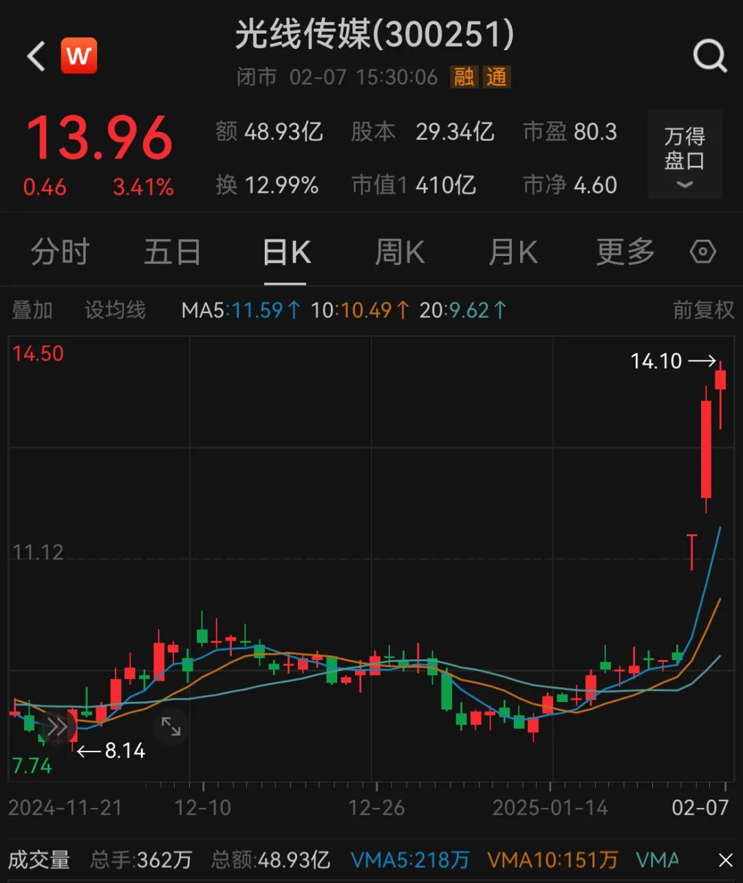 受此影响,光媒(3002511)截至2月7日收市。.SZ)多次迎来“撑杆跳”,股价上涨近28%,市值近410亿元。
