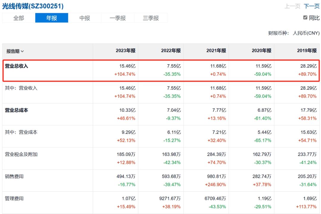 据财务报告显示,光媒近年来业绩大幅波动,2019年营收达到28.29亿元,2022年营收下降至7.55亿元,2023年营收上升至15.46亿元。归母净利润波动较大,2019年9.48亿元,2021年和2022年连续亏损,2023年扭亏为4.18亿元。