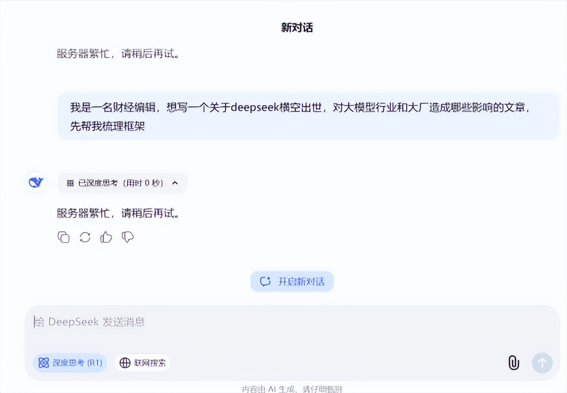 第一,从使用体验来看,Deepseek仍然无法承受蜂拥而至的流量。事实上,Deepseek在几年前就已经小规模地“爆红”了,那时它还可以一起使用深度思考和网络功能,输出文章的框架和成文的确令人惊叹。