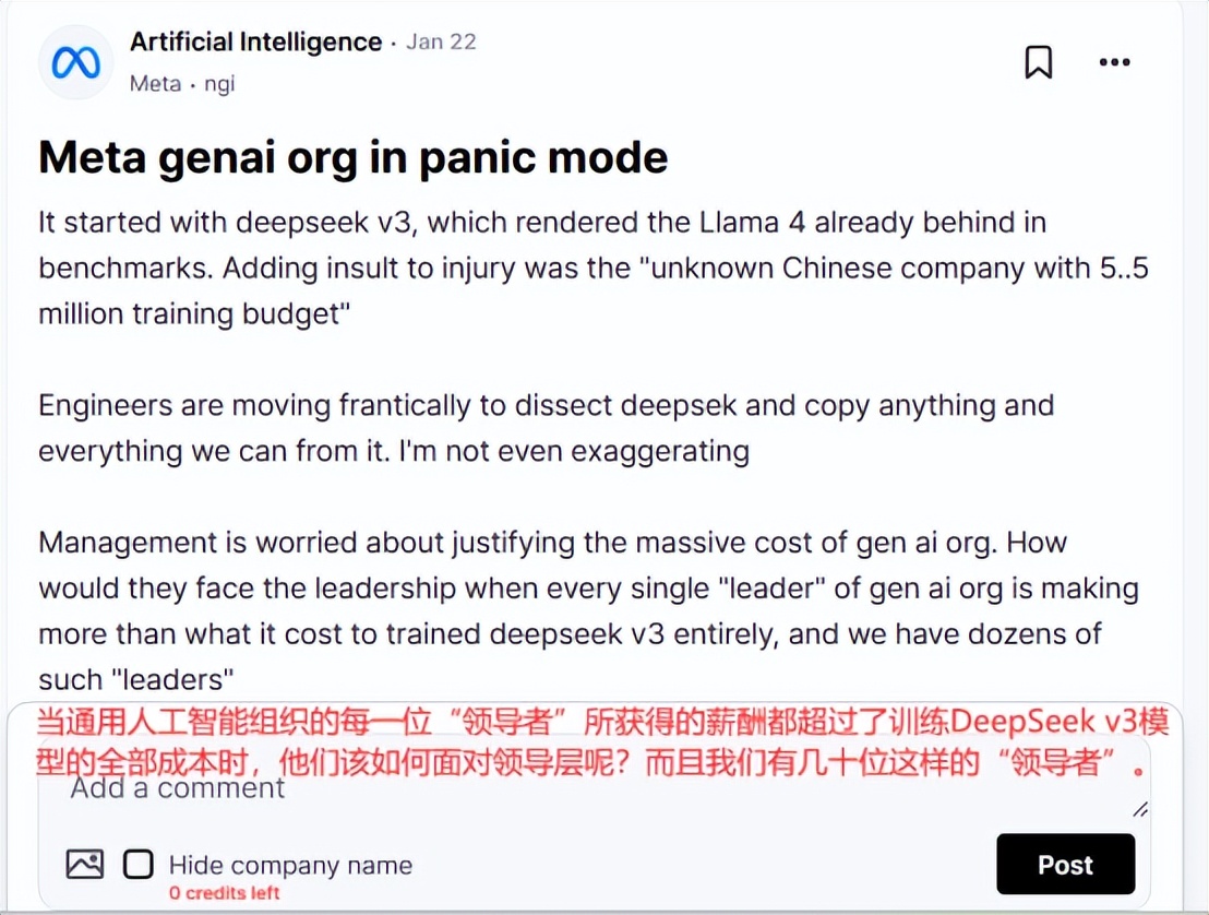 Deepseek-R1发布后,一名Meta员工在美国匿名职场社区teamblind上留言,称Deepseek最近的一系列动作让Meta的生成人工智能团队陷入恐慌。
