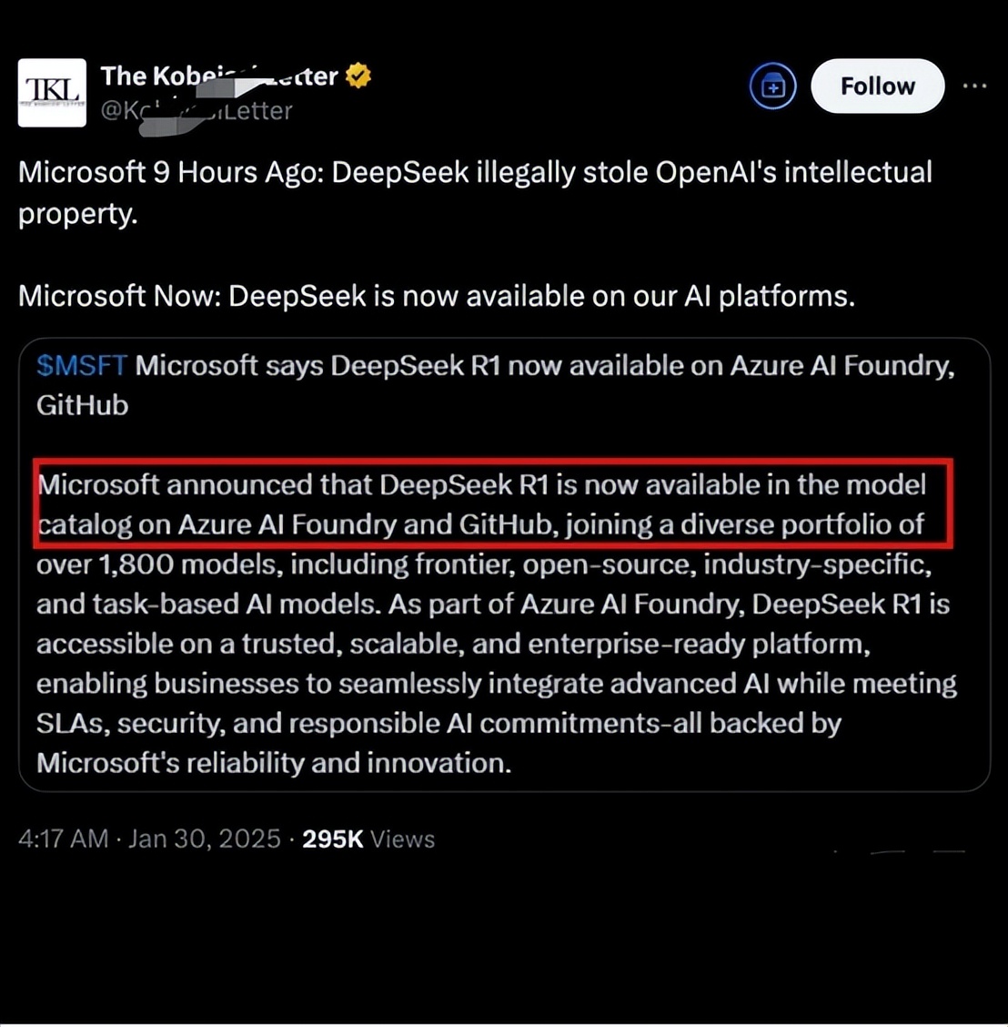 另外,根据彭博社等媒体的报道,微软也进行了调查。 OpenAI 中国的Deepseek团队是否以未经授权的方式获取技术输出数据,例如通过“蒸馏技术”非法获取模型导出数据。