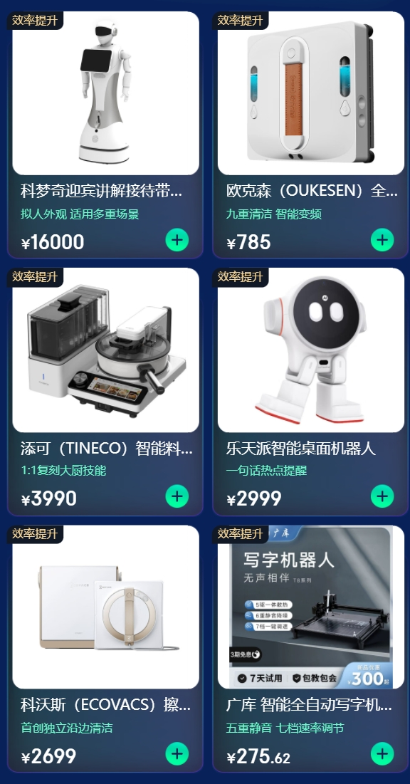 在提高效率方面,科梦奇欢迎客人讲解接待机器人、欧克森自动双向洒水窗机器人、添可智能烹饪机、乐天派智能桌面机器人、科沃斯窗户清洁机器人、广库自动写字机器人,可以帮助消费者完成客户或客户招待、日常家务、烹饪、材料撰写等基础工作,让客户以更高的效率投入到更重要的工作中。