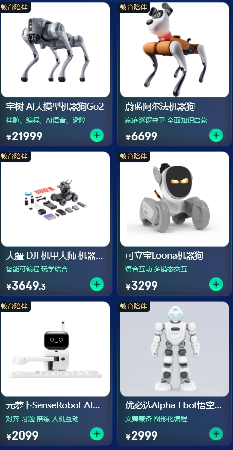 具体到产品层面,宇树Go2-Pro长续航机器狗可以帮助孩子在人文历史、算术猜谜、知识问答等各个方面成长。基于GPT模型的加持和大规模的AI模拟,简单易用的图形编程功能也可以率先开发孩子的创新意识。在JD.COM3C数码采销直播间72小时“奇妙红马甲展CES”直播中,客户跟随JD.COM采销,云观看到Go2机器人上下楼梯、跳跃、倒立等高难度动作。很多消费者在直播中留言说“太神奇了”。此外,蓝色阿尔法机器狗、DJI机甲大师、可立宝Loona机器狗等多种产品在教育陪伴方面也表现出色。