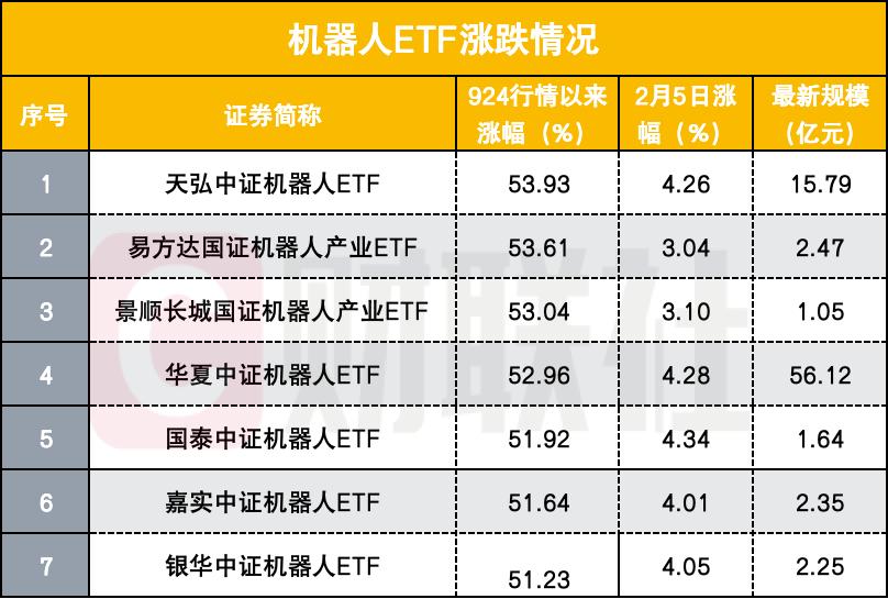受到许多利好消息的刺激,春节后2个交易日,机器人板块迎来了持续上涨的市场:2月5日,国泰、华夏、天弘、银华旗下CSI机器人ETF涨幅超过4%。截至发稿,今日相关产品涨幅已近3%。自去年924市场以来,该行业已经上涨了50%以上。
