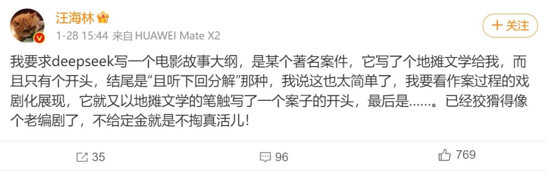 假设技术博主挥舞着思想手术刀,那么更广泛的一般博主/大V/KOL等等都握着“DeepSeek 该领域的破壁机,扩大了AI应用的边界。