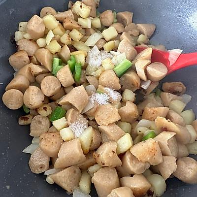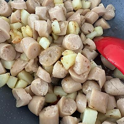 3、放入香肠继续煎至金黄色