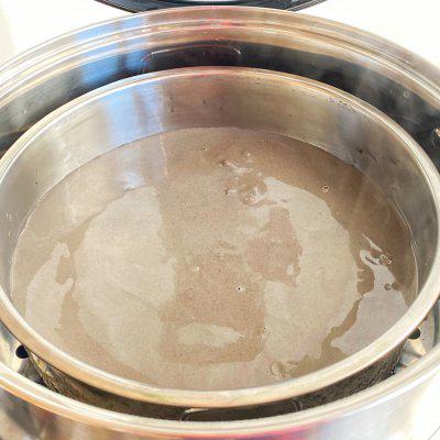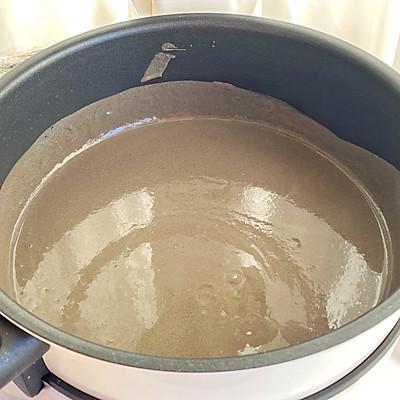 4、先将一半的黑芝麻糊倒入蒸盘中。