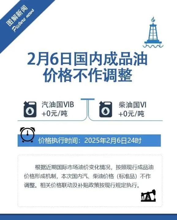 自2025年1月16日国内成品油价格调整以来,国际市场油价波动。根据目前国内成品油价格机制,2月6日前10个工作日的均价比1月16日前10个工作日的均价低于50元。根据《石油价格管理办法》第七条,汽柴油价格不调整,下一次调价时未调整的额度不计入累计或冲抵。