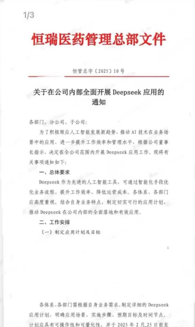 恒瑞药业开始采取行动,红头文件在春节假期结束后公布。董事长孙飘扬亲自发布了《关于在公司全面开展DeepSeek应用的通知》: