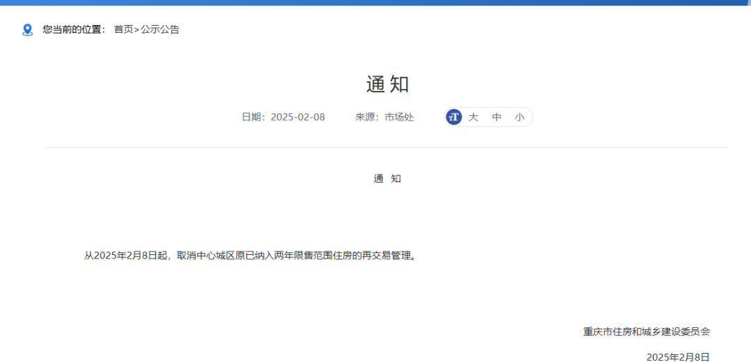 2月8日,重庆市住房和城乡建设委员会发布通知,从今天起,中心城区原已纳入两年限售范围的房屋再交易管理被撤销,意味着重庆自2017年起实施的限售政策正式结束。