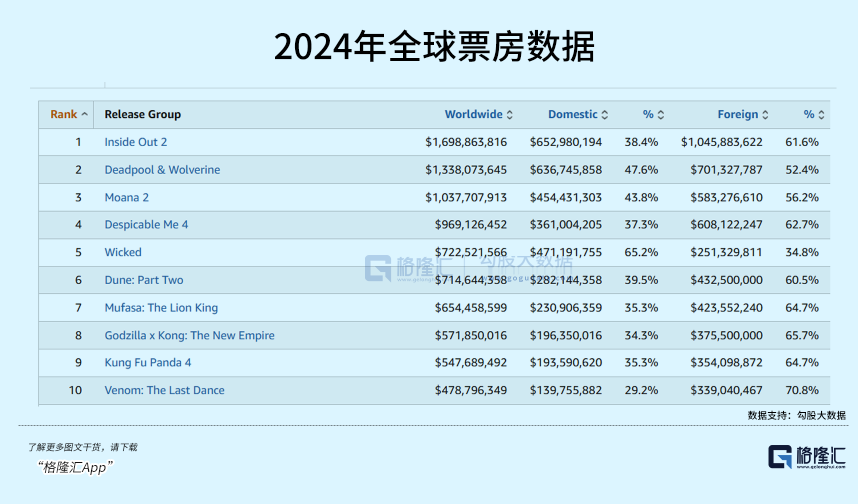 此外,在全球票房榜前十名中,《神偷爸爸4》、海洋奇缘2、《功夫熊猫8》票房分别为9.69亿美元、8.27亿美元和5.48亿美元,在票房排行榜上排名第3。、第4和第8位。