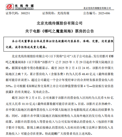 据光媒报道,《哪吒魔童闹海》自1月29日上映以来,截至2月4日,累计票房收入约为48.4亿元,公司来自该片的营业收入范围约为9.5亿至10.1亿元。