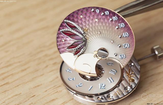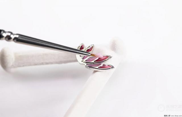 填充材料需要很大的耐心和技巧,太薄了,容易增加烧制失败率(因为没有胚胎可以附着),太厚了,达不到透明效果。所以难度系数特别大。纵观整个高档珠宝和高档制表领域,梵克雅宝是为数不多的能够将玻璃珐琅涂装工艺与作品融为一体的名门之一。