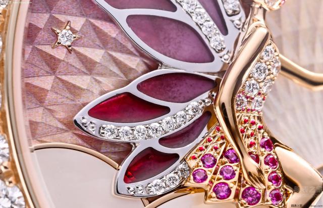 通透的羽翼出自梵克雅宝的精致之处。m é tiers d'art 大师工艺。在梵克雅宝 m é tiers d'art 在大师的工艺中,有珐琅、精细绘画、精细嵌入、雕刻等技巧。“霞光仙子”的翅膀融合了两个专业技术——半透明粉色。 plique- à -jour玻璃珐琅彩绘和不透明的粉色珐琅釉彩。
