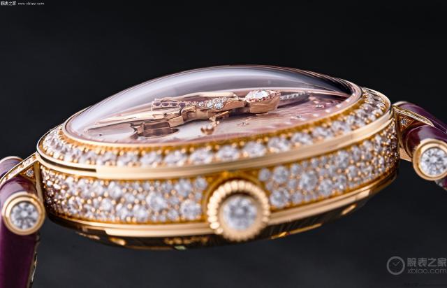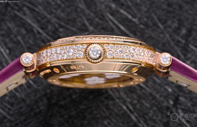 而且说到裸钻,通过实拍图可以看到,手表的表圈、表壳侧面、表把和表耳上,都镶嵌着裸钻。