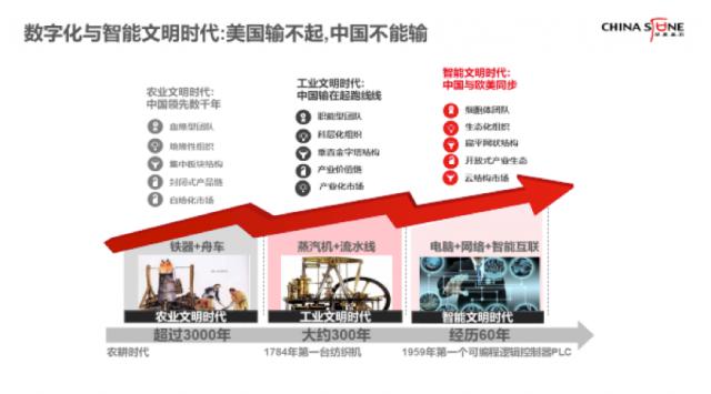 我们可能已经领先了一半以上的农业文明,中国在工业文明方面落后,大概是落后的。 100、150 年,甚至 200 年。现在,从某种意义上说,我们与世界同步,特别是从日常生活应用的角度来看,数字化、智能化,中国在某种意义上是先进的。数字化、智能化是一场革命,适应大量、碎片化、实时化、多场景客户需求的价值创造和获取方式。它是人类社会新的生产方式、新的产业组织方式和新的生活方式的结合,真正改变了人类的生活方式。