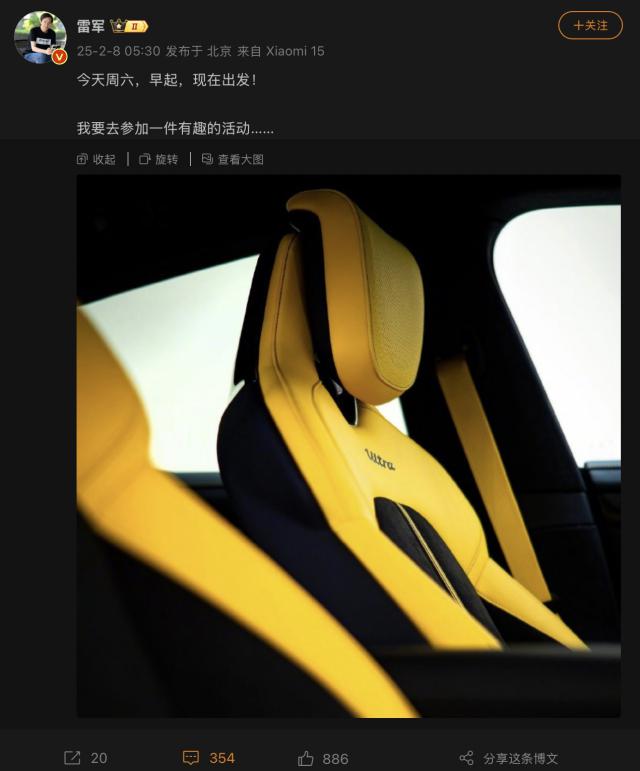 IT 世家 2 月 8 日消息,今天小米雷军 5 点 30 发布微博,配文称“今天星期六,早起,现在开始”、“我想参加一个有趣的活动”,但它没有透露具体的活动。但是在图片中,雷军展示了小米。 SU7 Ultra 内部照片,暗示相应的活动 SU7 Ultra 相关。