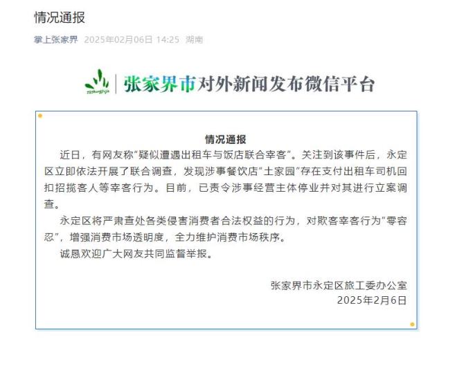 2025年2月6日,张家界市永定区旅游工作委员会办公室通报:近日,有网友表示“疑似被出租车与餐厅联合宰杀”。注意事件后,永定区立即依法进行联合调查,发现涉案餐厅“土家园”存在宰杀客户的行为,如支付出租车司机回扣。目前,涉案经营者已被责令关闭并立案调查。