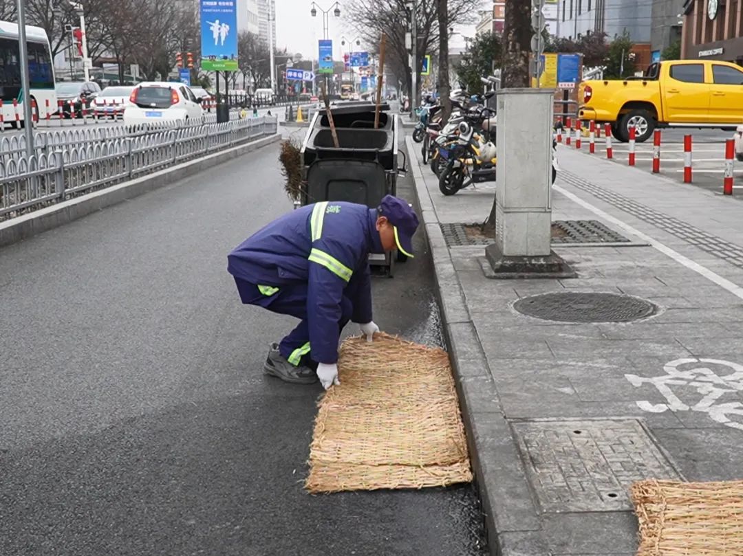 环卫工人除了清理路边的枯叶、碎纸等垃圾外,还根据往年的经验,在陡坡、出水口等容易积水结冰的区域铺设草包,避免道路湿滑,保障市民出行安全。