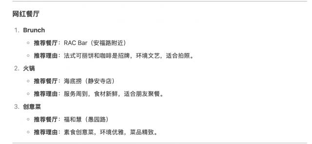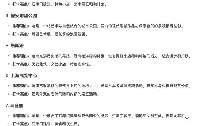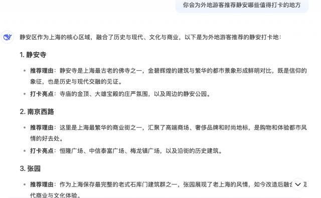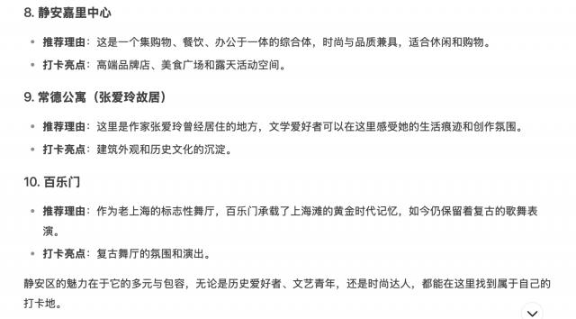 DeepSeek 一口气推荐了静安寺、南京西路、张园、静安雕塑公园、愚园路、上海博览中心、丰富里、静安嘉里中心、常德公寓、百乐门等。 10 一个打卡点,并仔细列出每一点的推荐理由和打卡亮点。