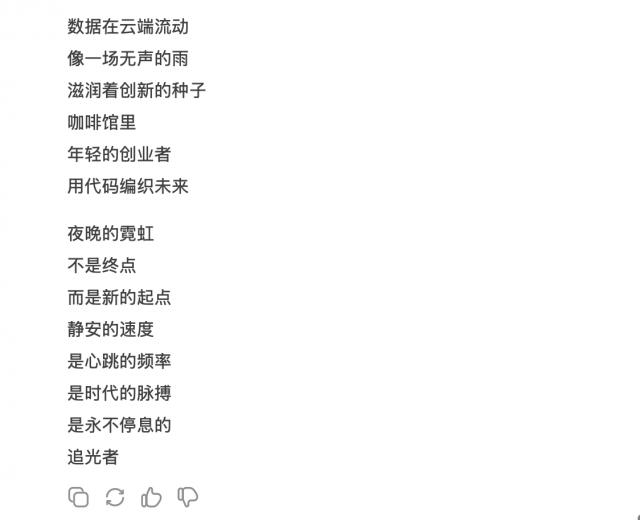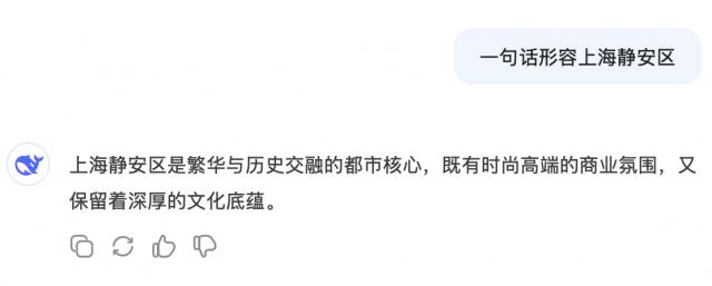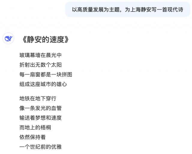 静宝早就跃跃欲试,问了一下。 DeepSeek 几个关于静安的简单问题和建议,也让它为静安写了一首现代诗《静安的速度》。让我们看看它眼中的静安有多精彩!