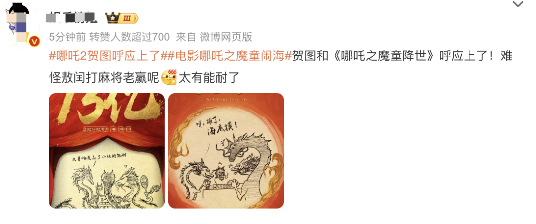 此外,还有网友发现,《哪吒2》贺图和《哪吒1》的贺图呼应上了。