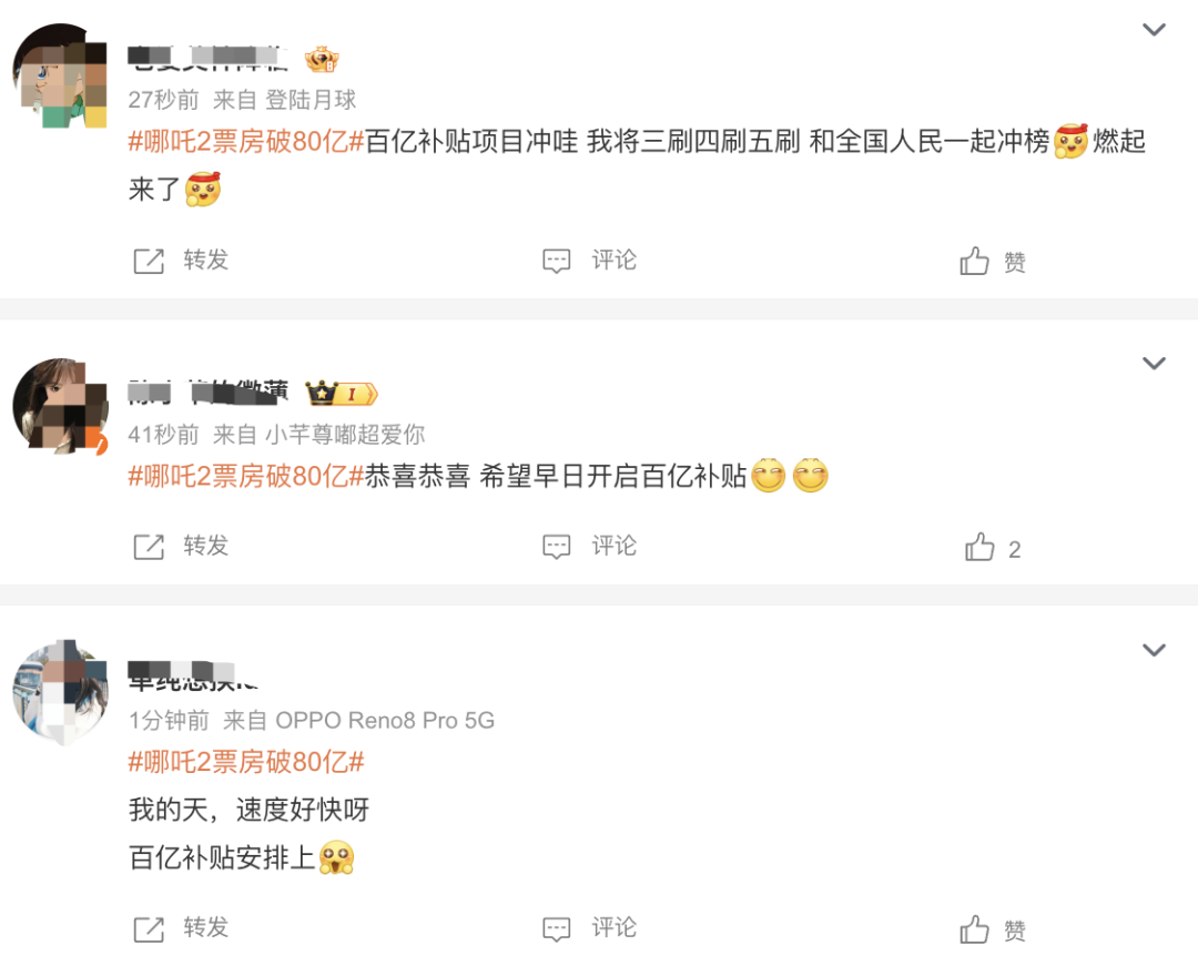 今日,除了“哪吒2票房破80亿”“哪吒2洛杉矶首映结束全场鼓掌”等话题外,“哪吒2 百亿补贴”“石矶娘娘的配音竟是公司行政”“哪吒2贺图呼应上了”“哪吒为啥不姓李”“哪吒2 百亿补贴”等话题也冲上微博热搜。